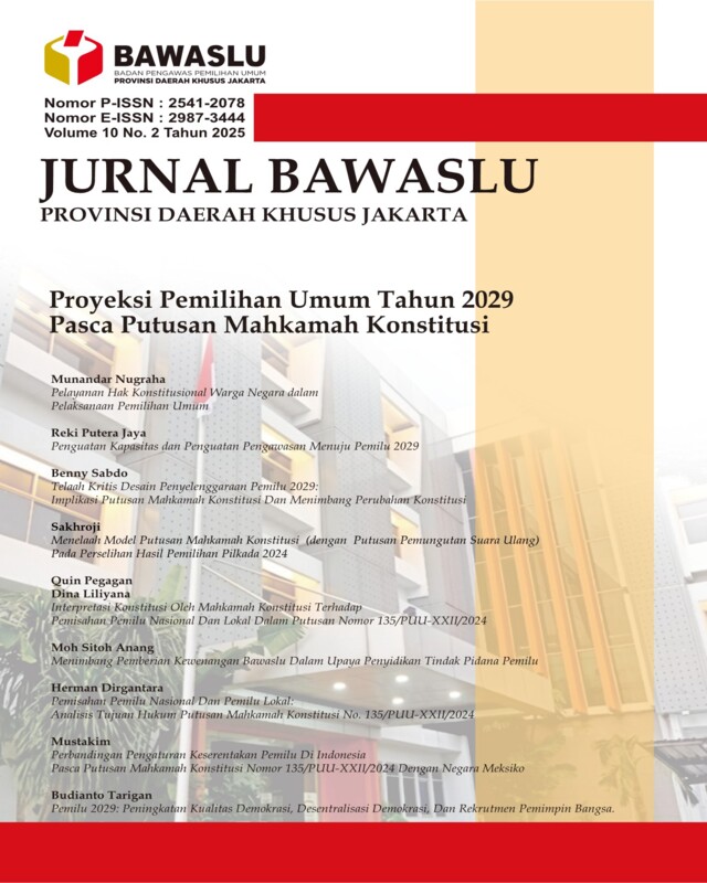 Catatan kritis terkait dengan pelaksanaan pemilu dan pemilihan tentu menjadi energi bagi bangsa ini untuk mendorong pelaksanaan pemilu dan pemilihan kedepannya menjadi lebih berkualitas sebagaimana Amanah UUD tahun 1945. Dinamika hukum atas lahirnya putusan MK yang memberikan arah evaluasi untuk merevisi UU Pemilu pun semakin mendinamisir pergulatan pemikiran tentang bagaimana pemilu selanjutnya dirancang. Baik dalam konteks landasan hukumnya, maupun dalam konteks pelaksanaan teknisnya, dengan berbagai catatan yang konstruktif. Jurnal Bawaslu Provinsi DKI Jakarta hadir sebagai bagian dari Amanah Sejarah, tidak hanya kaitannya dengan Amanah kelembagaan. Berbagai ide, pemikiran dan kegelisahan dari berbagai stakeholders, pegiat pemilu, pegiat demokrasi pemerhati kebijakan publik, pemerhati hukum, akademisi dan seluruh kalangan terhimpun di Jurnal ini.